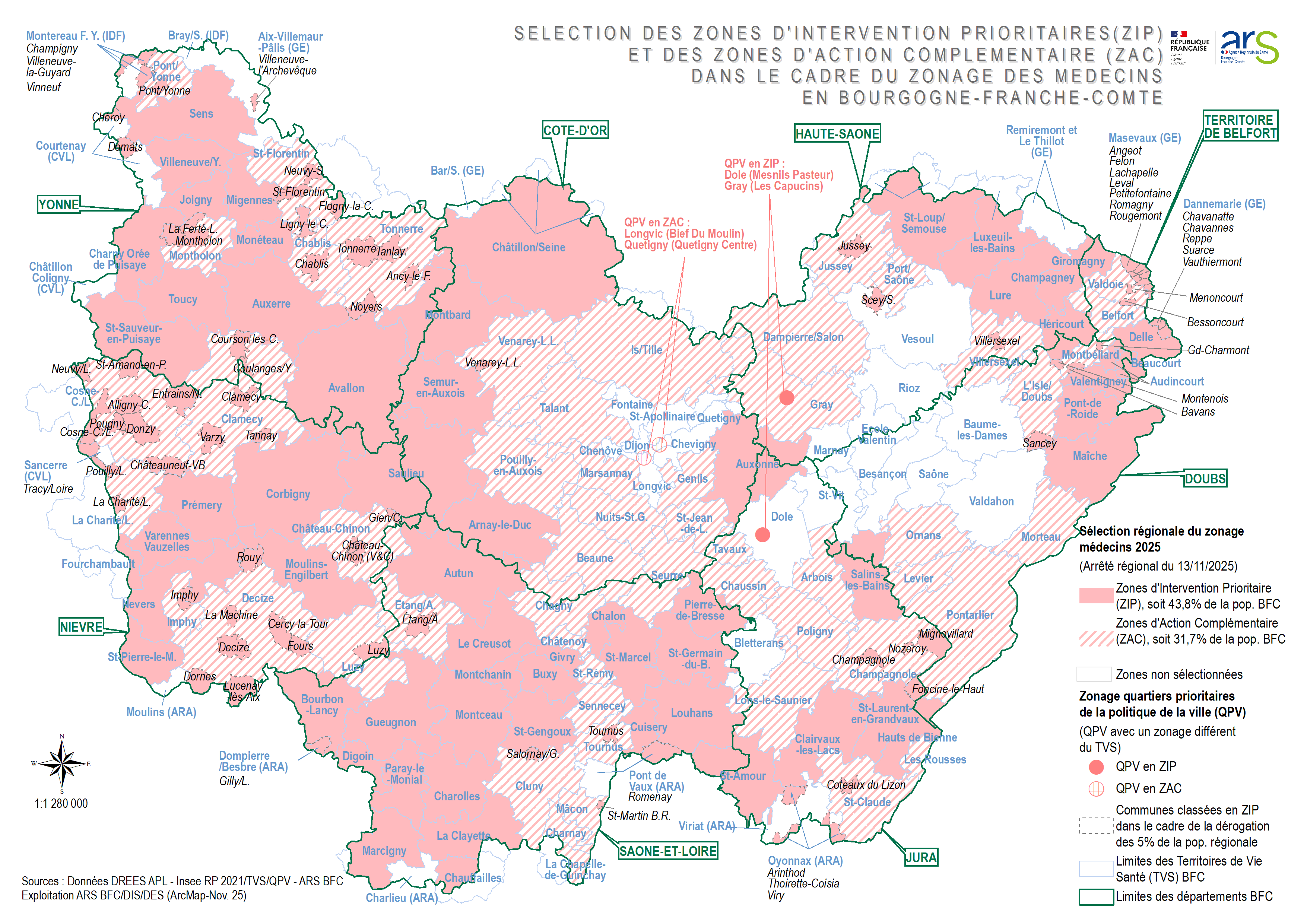 La révision 2025 du zonage s’appuie sur le cadre réglementaire national existant et a introduit une nouveauté importante : l’ARS a pu ainsi, lorsque les spécificités locales le justifiaient, raisonner à l’échelle de la commune plutôt qu’à celle des territoires de vie/santé.